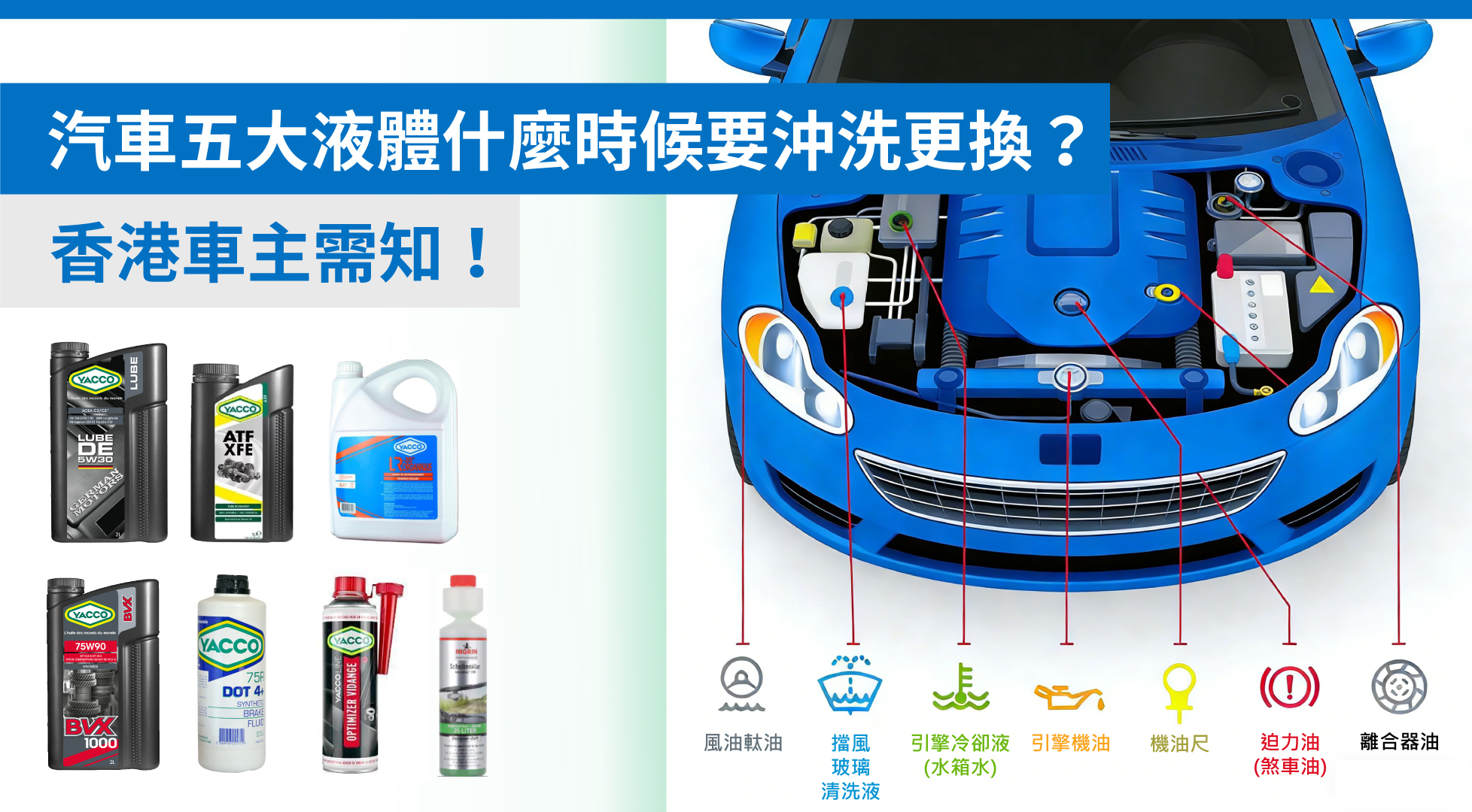 以下根據專業汽車維修建議,為香港車主總結最常見五大液體的沖洗/更換時間表 + 徵兆,一次過搞掂~記住:及早換 = 省大錢!